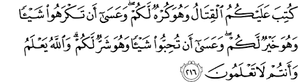 Fighting has been enjoined upon you while it is hateful to you. But perhaps you hate a thing and it is good for you; and perhaps you love a thing and it is bad for you. And Allah Knows, while you know not.